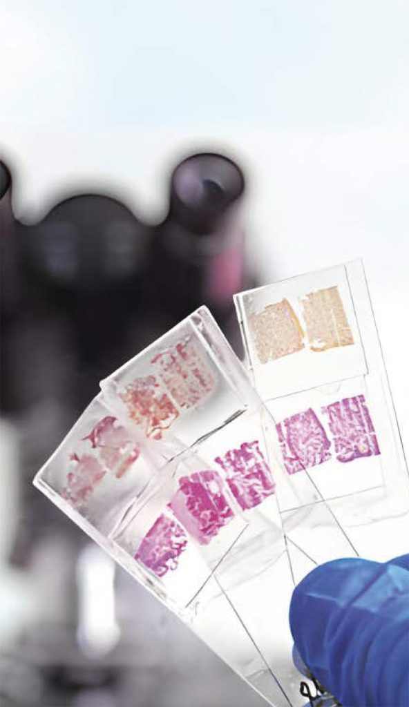 Já o histopatológico utiliza fragmentos de órgãos ou tecidos para diagnóstico. Existem dois tipos de coleta: a incisional, que gera um fragmento da lesão, e a excisional, que remove toda a lesão com margem de tecido saudável. Nosso setor é formado por profissionais qualificados para discussão dos casos e orientações sobre coletas.